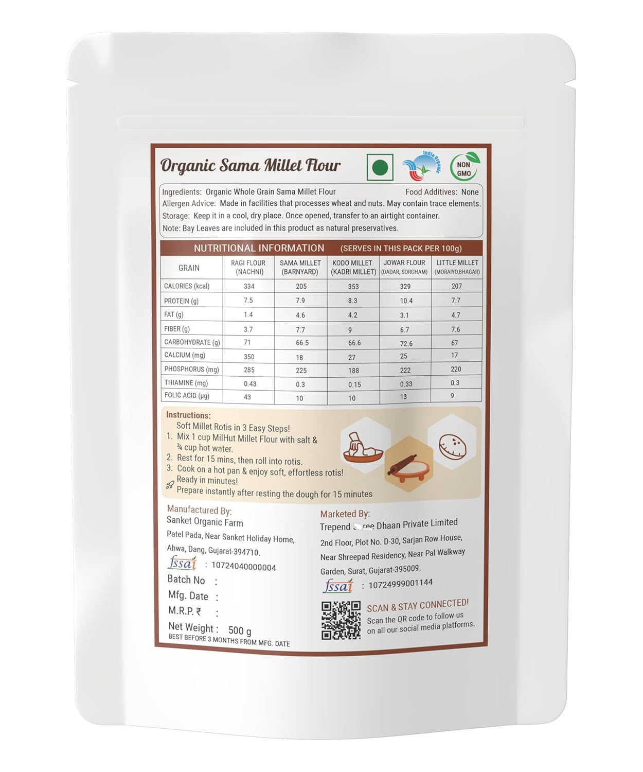 Premium organic sama millet flour made from naturally grown barnyard millet. Gluten-free, light, and easy to digest—ideal for fasting recipes, rotis, dosa, and healthy daily cooking.