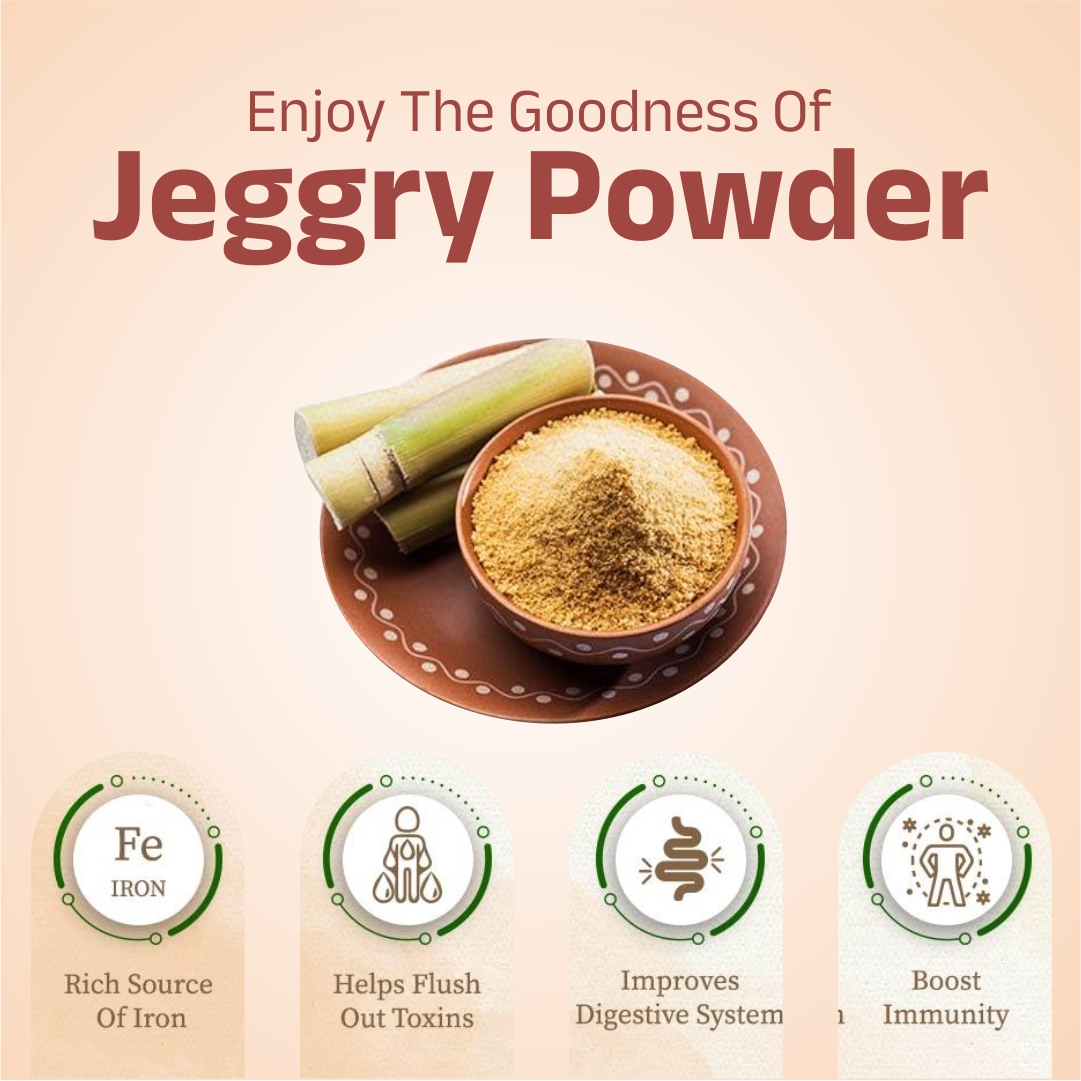 Pure, natural, and chemical-free Jaggery Powder made from fresh sugarcane juice. A healthier alternative to refined sugar — rich in minerals, iron, and natural sweetness.