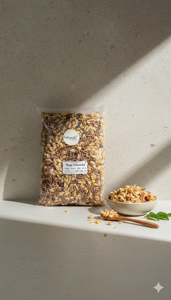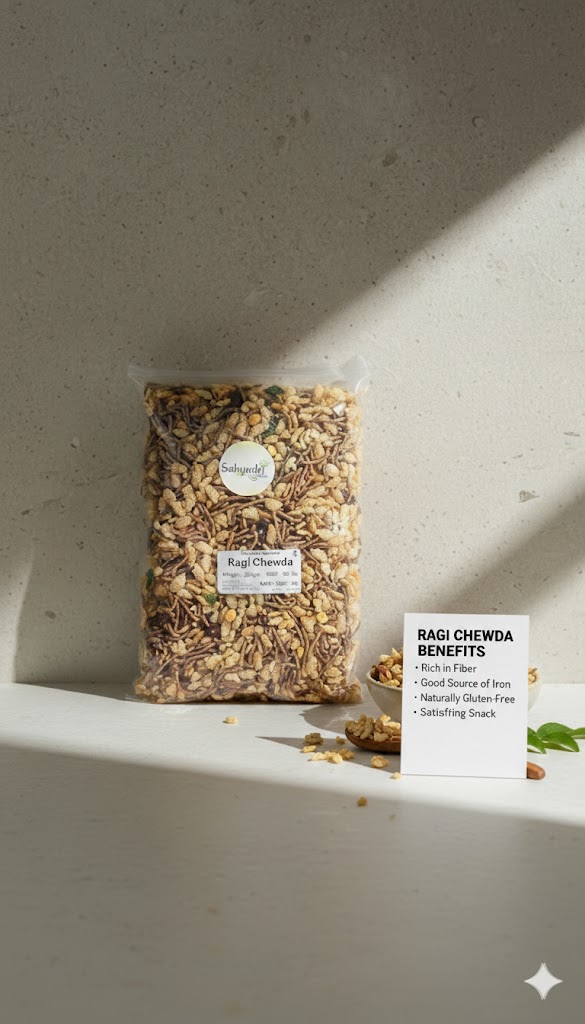 Healthy and crunchy Ragi Chewda made from nutritious finger millet flakes, blended with spices for a tasty and wholesome snack.